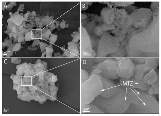 However, very small particles, presumably MTZ, were noticeable on the surface of the samples SM2, SM6 and SM7, where the latter two were prepared in ethyl acetate solutions with a high amount of MTZ. On sample SM2, MTZ was visible because the sample was unfiltered and the residual MTZ remained in the gaps between agglomerated particles (Figure 5C,D). This finding was consistent with the results of adsorption and XPS results obtained earlier (Table 3 and Table 4, Figure 3), which showed that the active substance covered most of the meso- and micropores and the surface.