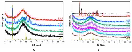 Figure 6A shows the XRD patterns of the Syloid based samples. The figure includes the reference as well as the samples coated with MTZ applying different preparation conditions. The reference Syloid sample was seemingly amorphous, but samples SyM1 and SyM3 showed no sign of a crystalline structure of MTZ either. However, on the XRD pattern of sample SyM2, characteristic diffraction peaks of MTZ were clearly visible beside the amorphous peak of Syloid. This result could be explained on the basis of the synthesis conditions (Table 1), since for this sample, the product was not filtered at the end of the process and the residual MTZ remained in the sample. As mentioned earlier, according to Maleki et al., the ratio of the pore diameter to the drug molecule should be greater than three [51]. However, too large a ratio may cause the crystallization of the active ingredient [60]. The size ratio of the Syloid pore to the MTZ molecule is more than seven, so the large pore size of Syloid may leave enough room for MTZ to crystallize during storage [51]. However, considering the crystalline size (55 nm) of the MTZ determined by the Scherrer formula, it is also possible that the MTZ accumulated on the surface in larger fraction, showing the characteristic MTZ spectra.