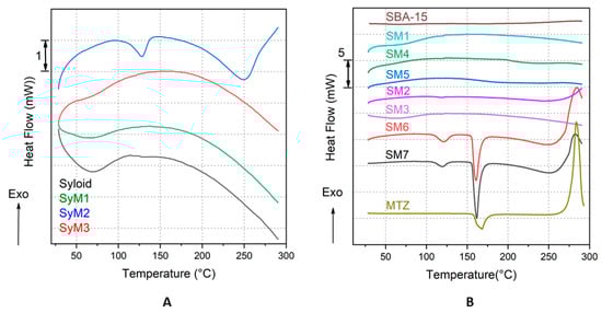 Figure 7. Heat flow (DSC) curves of the Syloid bound MTZ samples and the reference carrier, Syloid (A) and of the SBA-15 bound MTZ samples and the references SBA15 and MTZ (B).