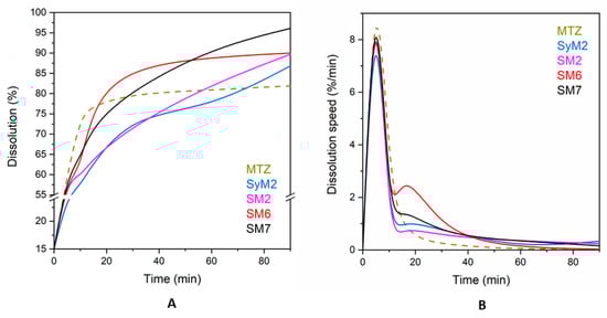 We performed release studies on four samples with the highest drug content (samples SyM2, SM2, SM6 and SM7) to evaluate the bioavailability of the drug immobilized on the silica carriers. Figure 8A shows that the dissolution profiles were similar for all immobilized drugs, while different for the micron-size MTZ particles. Metronidazole showed a saturation curve reaching a dissolution degree of 81.8% in 90 min. The dissolution of MTZ did not reach 100% due to the applied conditions, such as concentration, temperature and time. The immobilized drugs reached a higher ratio as compared to the dissolution of MTZ, around 90%. Sample SM7 had the best release (96.1%), followed by sample SM6 (90.0%) and sample SM2 (89.7%), and sample SyM2 was the last with 86.8%. These results are in line with the literature, according to which, poorly water-soluble active substances, such as MTZ, dissolve and are released faster after immobilization on mesoporous silica than the original active substance itself dissolves [65]. Maleki et al. immobilized itraconazole on SBA-15 and found that twice as much itraconazole dissolved as the pure drug itself in 2 h [51]. In our experiment, the difference was not so large; only a 5–10% difference could be seen.