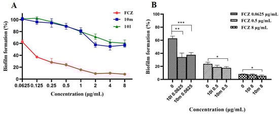 (A) Inhibition of biofilm formation in C. albicans with the treatment of FCZ, 10l or 10m alone at the indicated concentrations. (B) Inhibition of biofilm formation in C. albicans treated with FCZ in combination with 10l or 10m. * p < 0.05, ** p < 0.01, *** p < 0.001 compared to the corresponding FCZ-treated alone group.