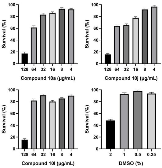 Due to the new types of triazine synergists, we examined whether the antifungal activity was caused by non-specific cytotoxicity. The cytotoxicity of active compounds 10a, 10j, and 10l were tested in a human umbilical vein endothelial cell line (HUVECs) by the CCK8 method. As shown in Figure 4, when compounds 10a and 10l were used alone at 32 μg/mL and 64 μg/mL, they displayed a slight inhibitory effect on the HUVEC cells (survival rate means: 83.19% and 81.88%, respectively), and at 4 μg/mL there was greater than 90% survival. In contrast, compound 10j showed moderate inhibitory effects on the HUVEC cells at 32 μg/mL (survival rate means: 65.28%), but greater than 90% survival at 4 μg/mL. Overall, the above results demonstrated that these compounds have a good safety profile at much lower MIC levels.