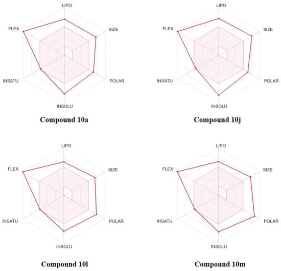 Drug-likeness is a significant drug research and development parameter that promotes molecules to be potential drug candidates. Therefore, it is necessary to evaluate these newly synthesized compounds’ ability as drugs by in silico predictions. As shown in the bioavailability radar formed by the SwissADME [31] (Figure 5), the physicochemical characteristics, lipophilicity, water solubility, and drug-likeness properties of four active compounds 10a, 10j, 10l, and 10m were all outside in the pink area (optimal range), indicating that these compounds had poor physicochemical properties and drug-likeness, such as size bulkiness (molecular weight > 500 Da), high polarity (TPSA > 130 Å2), poor water solubility (Log S (ESOL) < −6.00) and being too flexible (more than 9 rotatable bonds). Although these triazine derivatives exhibited excellent synergistic antifungal effects, they still had a lot of room for us to ameliorate their drug ability through further structural modifications.