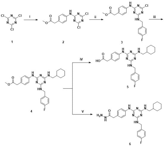 2.1.5. General Procedure for Synthesis of 2-(4-((4-((Cyclohexylmethyl)amino)-6-((4-fluorobenzyl)amino)-1,3,5-triazin-2-yl)amino)phenyl)acetohydrazide (6)