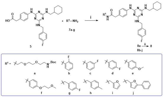 Synthetic pathway for hit compound 8 and 1,3,5-triazines derivatives 8b–j. Reagents and conditions: (i) PyBOP, DIEA, DMF, r.t., 3 h; (ii) 4 M HCl in ethyl acetate (EtOAc), EtOAc, 0 °C-r.t., 1 h.