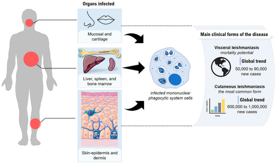 Leishmaniasis is considered one of the six most important infectious diseases due to its high detection coefficient and the ability to produce deformities, especially in the tegumentary form, which leads to disfiguring lesions, triggering severe psychological, social, and economic problems [17]. In the visceral form of the disease, the involvement of internal organs results in complications that are often lethal [18].