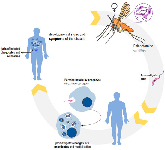 Leishmania parasites are transmitted by the bite of infected phlebotomine sandflies. The parasite develops in the intestine of the female vector, which, when performing blood meal, transmits to the vertebrate host promastigotes metacyclic forms of the protozoan. After inoculation, the infectious forms are encompassed by cells of the host mononuclear phagocyte system, such as macrophages, which differentiate into amastigote forms, initiating a process of intracellular multiplication by binary division within the phagolysosome. When filled with the protozoan, the host cells rupture, releasing parasites that will infect new cells of the vertebrate [19,20]. When performing the hematophagy in an infected host, the mosquito ingests cells with the amastigote forms of the parasite. After the disruption of the morphonuclear and release of the protozoan forms in the organism of the vector, these become flagellated again, initiating a process of extracellular proliferation and therefore capable of infecting new reservoirs [21,22] (Figure 2).