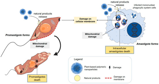During the last decade, polymer-based drug delivery systems have been used to enhance the performance of drugs in the treatment of leishmania [100]. In the same sense, the combined use of NPs with anti-leishmania natural products has been the target of research for the development of new treatments, as these nanocarriers can penetrate the macrophage cells and reach the infectious parasite, enabling targeted and efficient delivery [101]. Furthermore, natural compounds have shown the ability to generate changes in cellular structures, including at the mitochondrial level, leading to the death of promastigote and the intracellular amastigote forms [102,103,104,105] (Figure 4).