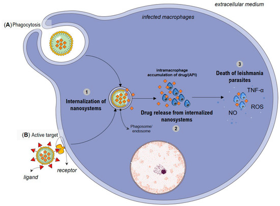 Enhanced antileishmanial activity of plant-based lipid colloidal drug carriers such as NE, LP, SLN, and NLC are emerging as a promising approach because the nanocarriers are readily internalized by macrophages in the liver and spleen (Figure 3), releasing the drug inside the cell and thus leading to a high local concentration, ultimately killing the parasites [92,93,94,95]. In this regard, the main strategy in treating Leishmania is to enhance macrophages’ drug targeting, using enhanced nanosized delivery systems. Another usual approach to also increase parasite selectivity is active targeting, which involves modification of the nanocarrier surface through a ligand for the receptor expressed by macrophages [87,96].