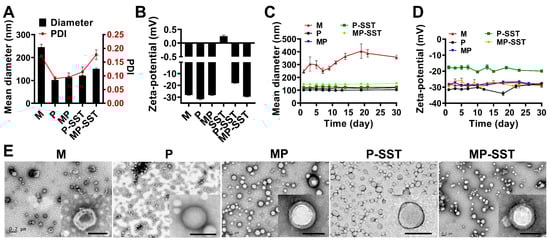 After the fabrication of P-SST, the macrophage membranes were utilized to camouflage the surfaces of nanoparticles. As shown in Figure 2A, the coating of membrane increased the diameters of nanoparticles from 101 ± 2 nm in P and 121 ± 1 nm in P-SST to 115 ± 1 nm in membrane-coated nanoparticles (MP) and 151 ± 4 nm in MP-SST, respectively. With a positive zeta potential, SST (0.25 ± 0.04 mV) increased the zeta potentials of the nanoparticles from −31.6 ± 0.6 mV in P to −18.1 ± 0.3 mV in P-SST. Under the coverage of the membrane, the MP and MP-SST showed similar zeta potentials to the membrane vesicles (M) (Figure 2B), indicating the transfer of the physicochemical properties of membrane materials onto the polymer nanoparticles. Different from the size increment of membrane vesicles under the storage in water for 1 month at 4 °C, the polymer-containing nanoparticles exhibited steady sizes and zeta potentials (Figure 2C,D), which demonstrated their stability. A hollow structure was shown in the TEM image of the membrane vesicles, while the membrane-coated nanoparticles showed the core-shell structure compared to the bare P or P-SST, directly proving the coating of cell membranes to the surfaces of nanoparticles (Figure 2E). The final MP-SST nanoparticles showed a two-phase SST release profile in which a first burst release was found within 24 h (about 50%) and followed by a sustained release, corresponding to the previously reported two-phase release profile of drugs in the membrane-coated PLGA nanoparticles [61,62].