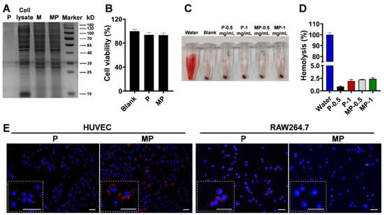 Given the importance of the proteins on the membrane to the nanoparticle properties, including the biocompatibility and targeting ability, the SDS-PAGE electrophoresis analysis was performed to investigate the protein components of the nanoparticles. The consistent protein profiles of MP with M, which were also found in the profiles of macrophage cell lysate, indicated the preservation and transfer of proteins from macrophage membranes to nanoparticles (Figure 3A). After incubation with the P and MP, the endothelial cells maintained their normal cell viabilities, which suggested the non-cytotoxicity of the nanoparticles (Figure 3B). Further analysis in the blood ex vivo showed that the hemolysis levels caused by all nanoparticles were below 5% (Figure 3C,D), demonstrating the biocompatibility of nanoparticles in circulation. It was found that the endothelial cells stimulated by TNF-α absorbed more MP than P, while the macrophages ingested more P than MP after 30 min of incubation (Figure 3E), suggesting the ability of MP to target the activated endothelial cells and escape the clearance by macrophages. All of that demonstrated the biosurface of the macrophage membrane enabled the MP with biocompatibility for administration and potential capability to accumulate in the inflammation-related sites in vivo.