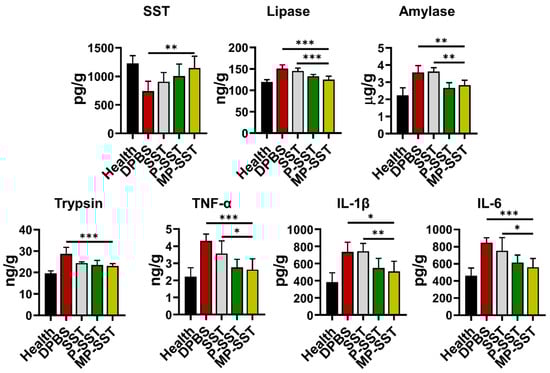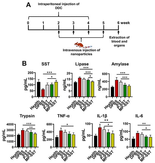 Chronic pancreatitis is associated with pancreatic atrophy, inflammation, fibrosis, exocrine dysfunction and endocrine disorder [63]. To investigate the regulation of these factors, nanoparticles were intravenously injected to mice with chronic pancreatitis induced by the diethyldithiocarbamate (DDC) [57,58]. In clinical management for pancreatitis, SST and some of its analogues are usually administered three times/day for successive days due to their short half-life [8]. Here, the treatments were administered once a week for four times to show the capability of nanoparticles in prolonging the therapeutic effects of SST. One week after the final administration, the blood and organs were extracted for analysis (Figure 4A). All SST-related treatments increased the content of SST in serum but the MP-SST enhanced the level to the highest extent compared to other treatment groups, demonstrating the efficiency of MP-SST to maintain the SST level as high as that in healthy mice. Owing to the recovery of SST content, the MP-SST showed the greatest ability to downregulate the chronic pancreatitis-related factors, including lipase, amylase, trypsin, TNF-α, IL-1β and IL-6 (Figure 4B). However, SST in its free form had a very modest and the lowest capability to regulate these factors, which may result from the fast degradation and short half-life of this peptide in vivo. All that suggested the capability of the membrane-coated nanoparticles to increase the content of SST to facilitate its regulatory functions in serum.