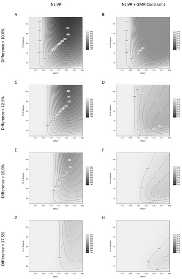 Power analysis for the proposed NLIVR conditions with and without a GMR constraint assuming increasing nominal differences between the test and reference formulations, for different WSCV and number of subjects. Legend represents the probability of concluding BE. (A,C,E,G) are related to the NLIVR conditions and (B,D,F,H) for the NLIVR with a GMR constraint, for each of the corresponding nominal differences from 10% to 17.5%.