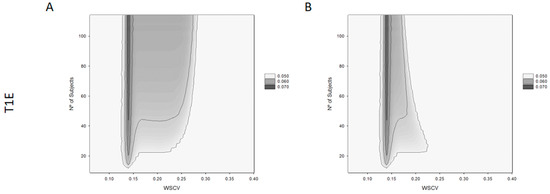 The results from the T1E analysis can be seen in Figure 3. The left plot (Figure 3A) shows the ability to conclude BE at the lower limit of the acceptance range, in relation to a homoscedasticity WSCV and sample size, for the proposed NLIVR criterion. The right plot (Figure 3B) shows the same relationship for the NLIVR criterion with the additional GMR inside the 90.00–111.11% constraint. In both situations, there is a slight inflation in the T1E mainly at around the WSCV of 13.93%, the cut-off value for the variability where the BE limit for unscaled average BE would start to be expanded proportional to the variability. This value is always below 7%. Inclusion of the GMR constraint does not change the highest inflation in the T1E, which is in the same “switching” zone, but the GMR constraint clearly reduces the overall area of T1E inflation.