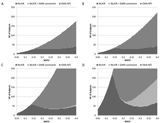 The sample size is calculated via iterative evaluation of power of the TOST procedure calculated as the success rate of showing BE as the sample size increases. For each BE metric (AUC and Cmax), in order to calculate the sample size for a BE trial, defining the following is needed (a) the one-sided significance level α, with a value of 0.05 (as commonly accepted by regulators), (b) the type-II error β (which defines the power of the trial (1-β)) (c) the BE acceptance range, (d) the expected GMR for the BE metrics, and (e) the WSCV. In the current EMA criterion, the acceptance range for NTI drugs is defined by the tighter 90.00 to 111.11% limits. For the proposed approach, the BE acceptance range is defined as shown in Figure 1, considering the changes in the criteria depending on the WSCV of the reference drug product. In this work, the GMR was varied from the scenario of no difference between products, with an expected GMR for the BE metrics of 1, to an increasing expected difference of 2.5%, 5% and 7.5% (corresponding to a GMR of 0.975, 0.95 and 0.925, respectively) and a power of 80% or 90%. The WSCV was varied from 5% to 40% (in steps of 0.125%). The same within-subject variability was assumed for the test and the reference products: however, when needed, σWR was estimated only from the data of the reference product. The study design for all scenarios was the two-treatment, three-sequence (TRR-RTR-RRT), three-period (2 × 3 × 3) partial replicate design. For the current EMA NTI BE criterion, the sample sizes were calculated based on the “Exact” method on the sampleN.TOST function of the PowerTOST package, on which calculations are performed based on formulas with Owen’s Q method [15]. For the new proposed criterion, the sample sizes were predicted based on simulations performed with the sampleN.scABEL function considering again the user define reg_const function on the PowerTOST package [12]. Each calculated sample size represents the minimum number of subjects that provides the target power, assuming a balanced number of subjects per sequence. In other words, the results were rounded upwards, and at the given sample size, the power was at least as high as the stated level.