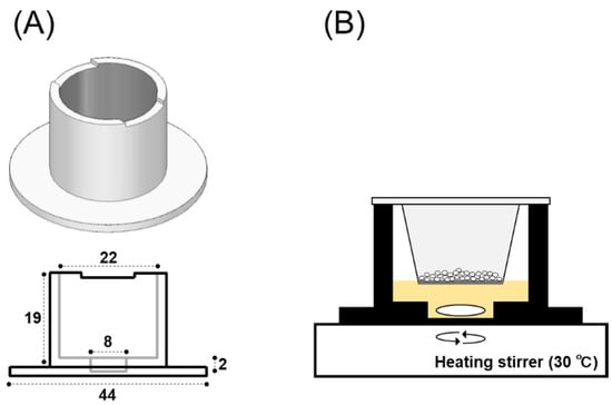 A chamber for evaluating drug dissolution into the ANF was constructed using a 3D printer (MakerBot Replicator+, Altech Co. Ltd., Tokyo, Japan) with polylactic acid filaments. In order to mount the cell culture insert (for 12 wells with a pore size of 3.0 μm, Falcon®, Corning Incorporated, Corning, NY, USA) in the chamber to allow the powders to come into contact with the ANF, the dissolution chamber was designed to set the claws of the insert, and a hole was made in the bottom to accommodate the magnetic bar (2 × 8 mm) for stirring the ANF during the experiment (Figure 1A).