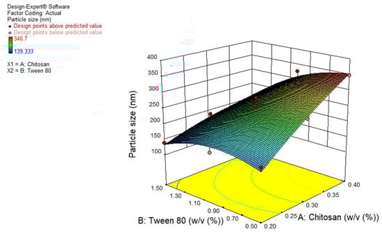 where A and B are the concentrations (% w/v) of Chitosan and tween 80, respectively. The positive sign shows direct and the negative sign shows an inverse relationship between the independent variable and response. The polynomial equation generated for particle size (Y1) demonstrated that both chitosan concentration (regression coefficient = 67.6, F value = 57.9) and tween 80 (regression coefficient = −41.4, F value = 21.7) have a significant effect on particle size. Increasing the concentration of chitosan significantly increased (p < 0.05) the particle size (Table 1 and Figure 1). However, a significant reduction in particle size (p < 0.05) occurred when the concentration of tween 80 was increased (Table 1 and Figure 1).