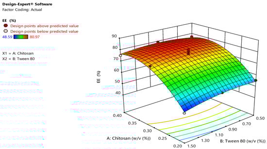 3D surface plots showing effect of chitosan and tween 80 concentration on the EE of TBN-CSNP.