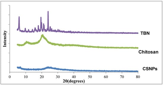 As TBN is crystalline in nature so the diffraction spectrum depicted sharp and intense peaks for TBN whereas, chitosan showed a peak at 10.38°, which corresponds to the hydrated crystalline form. The peak at 20.83° corresponds to the regular crystal lattice of the chitosan. These peaks confirmed the hydration and semicrystalline nature of chitosan (Figure 5). The spectrum of CSNP showed the disappearance of the hydrated crystalline peak (10.38°) and a reduction in the intensity of the peak at 20.83°, which confirmed the reduction in the crystallinity and amorphous nature of prepared TBN-CSNP.