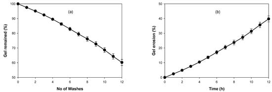 The erosion profiles were determined by the gravimetric method [33] with slight modification. Briefly, 1 g of TBN-CSNP loaded P407 gel formulation (equivalent to 10 mg of TBN) was added into a small glass tube, which was kept in a beaker containing water maintained at 32 °C. Phosphate buffer pH 5.5 (3 mL) equilibrated at 32 °C was added into the glass tube. At regular intervals, the phosphate buffer was removed, and a reduction in the weight of the P407 gel was noted to determine the amount of eroded gel. One cycle of addition of solvent and removal was considered as one washing and the number of washings required to remove the percentage of P407 gel from the glass tube was noted.