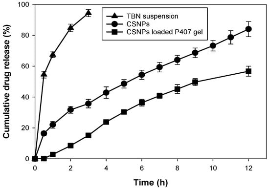 The P407 gel was prepared by adding P407 (27.32% w/w) and TGA (4.72% w/w) to water and then kept at 4–5 °C until a homogenous solution was obtained. TBN-CSNP loaded P407 gel formulation was prepared by mixing CSNP (equivalent to 10 mg TBN) with a sufficient quantity of P407 gel solution to produce 1 g of the final gel formulation at 4 °C. The solution was warmed until a smooth gel was produced [28,29]. TBN-loaded gel and TBN-loaded P407 gel (without TGA) were also prepared [13].