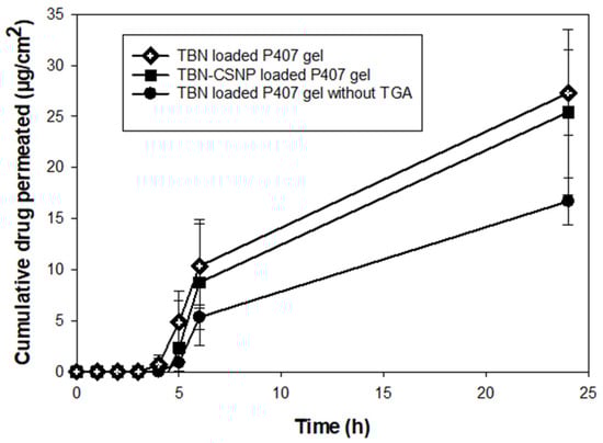 Ex vivo permeation across nail from TBN-CSNP loaded gel, TBN loaded P407 gel and TBN loaded gel (without TGA). Each value represent mean ± S.D (n = 3).