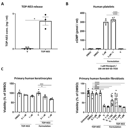 A non-toxic liquid hydrogel formulation allows release of active TOP-N53. (A) TOP-N53 concentration as measured by LCMS multiple reaction monitoring in human blood plasma diluted with simulated interstitial fluid buffer (1:1) following 24 h incubation in a rapid equilibrium dialysis device system. N = 3 per treatment group. N.D.: not detectable; V: Vehicle. (B) Washed human platelets were incubated with riociguat (1 µM) and BAY 60-7550 (100 nM) for 10 min and then treated with 3 µM of TOP-N53 hydrogel formulation or vehicle hydrogel formulation (V) or vehicle hydrogel formulation and 3 µM of TOP-N53 dissolved in DMSO for 2 h. Incubation was terminated by adding 20 µL of 2 N HCl. Total cGMP (pmol/mL) was measured by ELISA. N = 4 independent experiments using platelets from different donors. Primary human keratinocytes ((C), left) or foreskin fibroblasts ((C), right) were incubated for 22–24 h with 0.1 or 1 μM TOP-N53 in DMSO (0.01%) or 0.01% DMSO only, or with vehicle liquid hydrogel formulation (V) or TOP-N53 at final concentrations of 0.1 or 1 µM in liquid hydrogel formulation or with 10-, 100- or 1000-fold dilutions of the liquid hydrogel formulation in culture medium as indicated and analyzed for cell viability using MTT assay. N = 4–12 technical replicates per treatment group. Bars indicate mean +/− SEM. * p ≤ 0.05, ** p ≤ 0.01, *** p ≤ 0.001, **** p ≤ 0.0001 (Ordinary one-way ANOVA, one sample t test for data shown in Figure 1A).