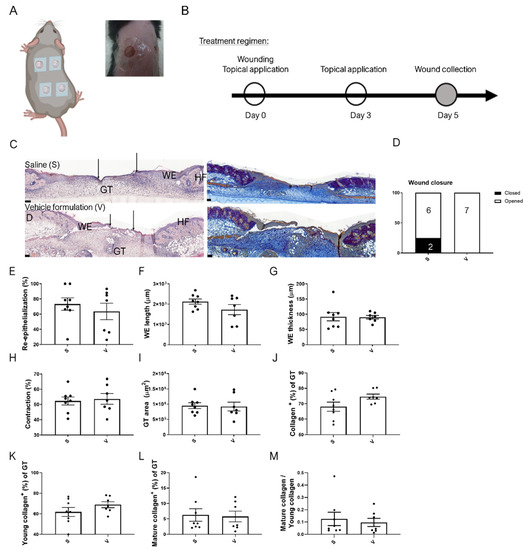 To test if the formulation affects the wound healing process, vehicle liquid hydrogel formulation or saline solution were dripped topically on full-thickness excisional wounds of C57BL/6 mice, followed by the application of skin adhesive at the wound perimeter and attachment of occlusive wound dressing. This treatment was performed immediately as well as at day 3 after wounding (Figure 2A,B). Histomorphometric analysis of wound sections showed similar outcomes of healing and wound appearance with saline or vehicle liquid hydrogel formulation treatment (Figure 2C–I), emphasizing the safety of the formulation under the experimental conditions. Herovici staining, which stains young and mature collagen fibers in blue and purple, respectively [17], did not reveal obvious differences in the collagen-positive area in the granulation tissue between the vehicle formulation and saline treatment groups. Similar areas of young and mature collagen fibers and their ratio were observed, further emphasizing that the formulation does not affect the healing process (Figure 2C (right) and Figure 2J–M).