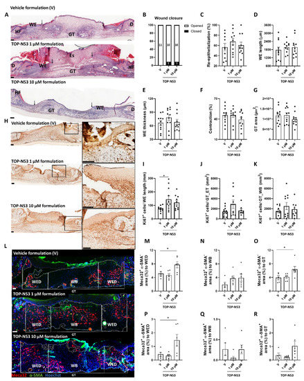 TOP-N53 at 1 and 10 µM was applied in the formulation using the same procedure and treatment regimen as for the vehicle (Figure 3A,B). The treated mice did not show weight loss throughout the experiment (Figure S1A). A slightly higher percentage of the TOP-N53 formulation-treated wounds were closed at day 5 compared with the vehicle formulation-treated wounds, although the difference was not statistically significant (Figure 3A,B). As expected for healthy mice in which the wound healing process is highly efficient, TOP-N53 treatment had no significant effect on re-epithelialization, length and thickness of the wound epidermis, wound contraction and granulation tissue area (Figure 3C–G). This was confirmed by semi-quantitative wound scoring (Figure S1B). However, TOP-N53 formulation-treated-wounds showed increased proliferation of keratinocytes in the wound epidermis as demonstrated by Ki67 immunostaining, and the difference was significant at 1 µM TOP-N53 (Figure 3H–I). A mild, but non-significant increase in cell proliferation was also observed in the granulation tissue below the epithelial tongue and in the wound bed (middle of the wound) (Figure 3H,J,K). Treatment with TOP-N53 formulation caused only a very mild increase in CD68+ macrophages and Ly6G+ neutrophils in the granulation tissue, and only at the highest concentration (Figure S1C,D).