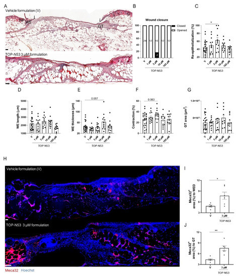 Next, we tested the therapeutic efficacy of TOP-N53 liquid hydrogel formulation in mice with genetically determined type II diabetes (db/db mice), an established mouse model for impaired wound healing [22]. The diabetic condition of these mice was confirmed by analysis of blood glucose levels (Figure S2A). We then generated full-thickness excisional wounds in these mice and treated them topically with vehicle formulation or TOP-N53 formulation at different concentrations according to the treatment procedure and regimen shown in Figure 2A,B. Neither TOP-N53 formulation at different concentrations nor vehicle formulation treatment affected the body weight during the treatment period (Figure S2B). At day 5, most wounds were not fully re-epithelialized (Figure 4A,B), with the exception of two wounds treated with 3 µM TOP-N53, which were closed (Figure 4B). Histomorphometric analysis of the H&E-stained 5-day wound sections revealed that the impaired re-epithelialization that is characteristic for wounds in db/db mice (compare Figure 3C and Figure 4C) was significantly improved upon treatment with 3 µM TOP-N53 (Figure 4C). TOP-N53 3 µM formulation seemed to be an optimal treatment under these experimental conditions, as the wound re-epithelialization rate showed a “bell”-shaped-like curve and was no longer increased at higher concentrations. Wound re-epithelialization is achieved by a combination of keratinocyte migration and proliferation. A very mild increase in keratinocyte migration in the TOP-N53 treated wounds was suggested based on the length of the wound epidermis (Figure 4D). The thickness of the latter was only affected following treatment with a higher concentration of TOP-N53 formulation (Figure 4D,E). Wound contraction was mildly, but non-significantly increased upon treatment of wounds with TOP-N53 3 µM formulation (Figure 4F), while the area of granulation tissue was not altered (Figure 4G). However, TOP-N53 had a strong effect on the vasculature. There were significantly more vascular endothelial cells at the wound edges and in the entire granulation tissue in wounds treated with TOP-N53 3 µM vs. vehicle formulation, as reflected by Meca32 staining (Figure 4H–J), demonstrating that TOP-N53 3 µM formulation enhances wound angiogenesis.