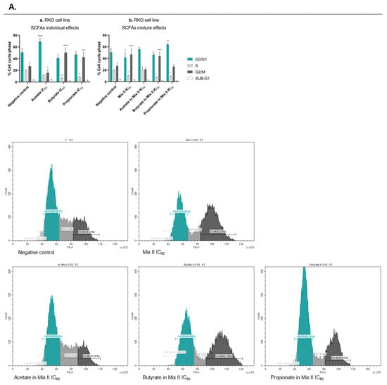 Cell cycle was evaluated through the measurement of the DNA content. RKO and HCT-15 cell lines were seeded in 12-well plates at a final density of 1 × 105 cells/mL. After adhering for 24 h, cells were treated with fresh complete medium as negative control, as well as with the IC50 of each SCFA (81.04 mM of acetate, 10.84 mM of butyrate, 32.25 mM of propionate for RKO and 89.52 mM of acetate, 4.57 mM of butyrate, 22.70 mM of propionate for HCT-15). Additionally, the IC50 of mixture II was also tested, as well as the corresponding concentrations of each SCFA in that mixture (47.61 mM of Mix II containing 28.57 mM of acetate, 7.14 mM of butyrate, and 11.90 mM of propionate for RKO; 13.67 mM of Mix II containing 8.20 mM of acetate, 2.05 mM of butyrate, and 3.42 mM of propionate for HCT-15). After 24 h of treatment, cells were collected, resuspended in 500 μL PBS and incubated on ice for 15 min. An amount of 1.5 mL of 96% (v/v) cold ethanol was added and the cells were incubated for 15 min on ice. Then, cells were washed, resuspended in 500 μL of PBS, and incubated with 50 μL of RNase A solution (200 μg/mL in sodium citrate 1% (w/v)) at 37 °C for 15 min. An amount of 50 μL propidium iodide (PI) staining solution (0.5 mg/mL in sodium citrate 1% (w/v)) was then added and the cells were vortexed and incubated at room temperature for 30 min in the dark. PI mean fluorescence was analyzed by flow cytometry using PE-A channel.