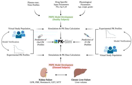 Previously, for pharmacokinetic (PK) analysis, conventional mammillary models were used that were highly dependent on drug quality and had indistinct biological features []. However, now for the sake of drug development, a variety of computational models are present. These models represent a mechanistic representation of the drug in the biological system allowing a deductive simulation of drug concentration-time profiles by incorporating information on the drug with little knowledge of the physiological system at the organism level []. Teorell firstly described the concept of physiologically-based pharmacokinetic (PBPK) modeling in 1937. PBPK recruits richer informational content compared to the empirical models concerning the anatomy and physiology of the associated system, making it possible to predict drug exposure in unreachable tissues where the drug exerts its toxic or beneficial effects. It also provides beneficial information in predicting the plasma concentration vs. time profiles with the help of preclinical in vitro and in vivo data to support decisions at various drug development stages []. In literature, models have been developed previously for drugs in the case of hepatically impaired [] and chronic kidney disease populations (CKD) [].
