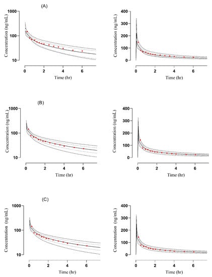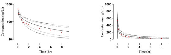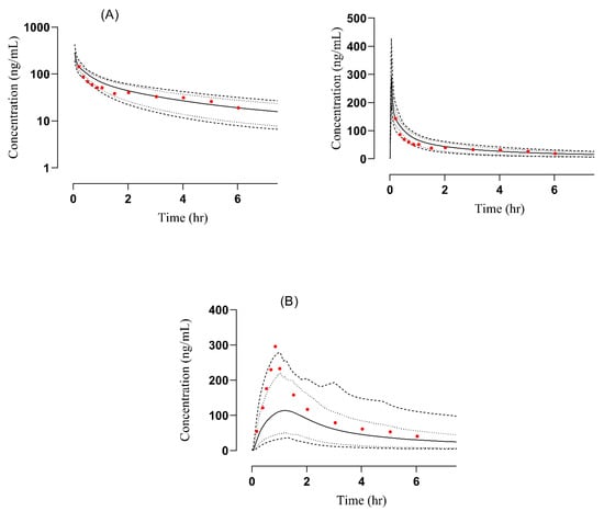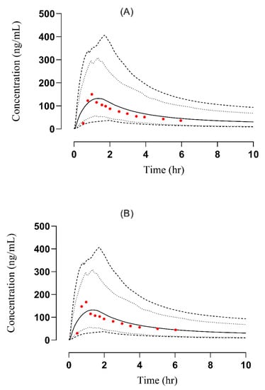 Comparison of observed and predicted plasma concentration versus time profile in healthy subjects after oral administration at a dose of 200 mg. (A) [], (B) []. The solid line [―] indicates the arithmetic mean, dash line [----] maximum and minimum, the dotted line [….] 5th–95th percentile, red dots indicate observed data, and the solid line indicated predicted data.