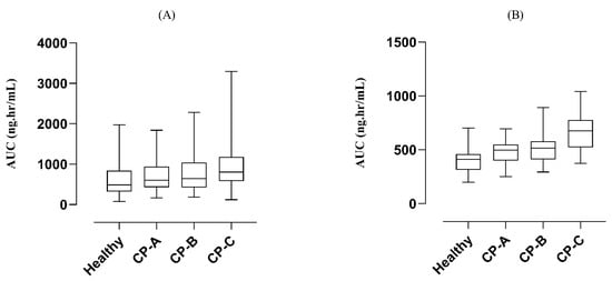 Box-whisker plots after (A) oral (200 mg) and (B) IV (0.5 mg/kg) dose of labetalol in healthy, CP-A, CP-B, and CP-C populations to compare AUC.