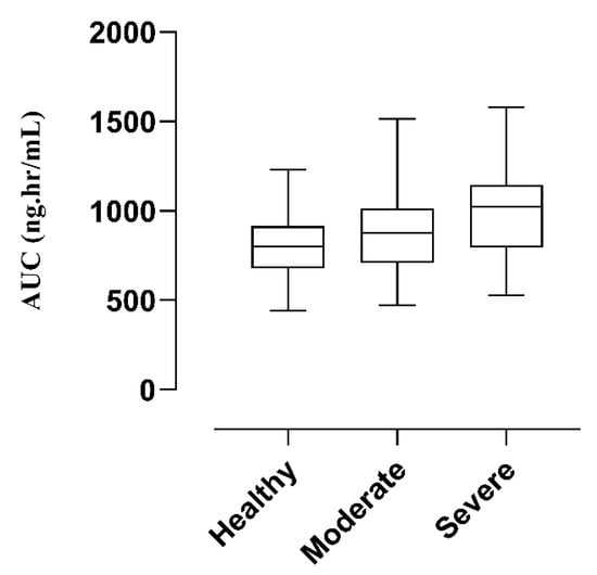 The comparison of observed and predicted data points after IV administration is given in Figure 6. A notable increase in the AUC from 590.26 ng/mL·h to 758.806 ng/mL·h and Cmax from 535.697 ng/mL to 588.037 ng/mL was observed. The calculated Robs/Rpre values of Cmax and AUC were 0.91 and 0.77, respectively. These values were in two fold error range and acceptable for the model []. A detailed description of the R obs/R pre ratio is given below in Table 4. The AFE values for Cmax and AUC were 0.912 and 0.77, respectively, and have been documented in Supplementary Table S11. After developing the PBPK model of labetalol in healthy, for dose optimization in patients with kidney disease, Box-whisker plots were made in a sample size comprising 100 subjects (ages: 37–70 years, weight: 75–87 Kg) after IV administration, and the AUC compared in healthy was 799.7 ng/mL·h (740.0–859.7), which increased to 876.9 ng/mL·h (818.3–933.5) in moderate renal failure and 1023 ng/mL·h (952.9–1085) in severe renal failure, respectively (Figure 7). This increase in AUC with an increase in the severity of the disease helps in dose adjustment in such kinds of patients.