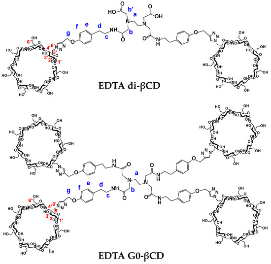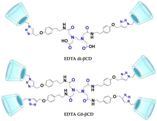 In recent years, nitrogen-containing dendrimers have been used as peptidomimetic agents, with promising applications for the delivery of anticancer drugs [48]. In this regard, nitrogen-containing dendrimers with an ethylenediaminetetraacetic acid (EDTA) core have shown important properties for drug delivery applications [49,50]. For those reasons and due to the drawbacks described above with the use of PAMAM dendrimers, in this work we present the design, synthesis and full characterization of new dendritic and G0-dendrimer PAMAM analogs with an EDTA core, functionalized with two and four βCD units on the periphery, EDTA di-βCD and EDTA G0-βCD compounds, respectively (see Figure 1). We have used two powerful methodologies: click chemistry through copper(I)-catalyzed alkyne–azide cycloaddition (CuAAC) in standard conditions, and microwave irradiation. This synthetic approach enabled the obtention of EDTA di-βCD dendritic molecule in high yields and short reaction times. Having two empty βCD on the periphery, EDTA di-βCD has the capacity to transport two guest molecules. Furthermore, the remaining COOH functional groups can be used for later vectorization with different functionalities. The EDTA G0-βCD dendrimer has potential increased drug-loading capacities due to the presence of four βCD units in the periphery. The structural design of EDTA core βCD dendrimers presented here offers an alternative to the classic EDA core PAMAM dendrimers, with potential applications as new drug carriers.