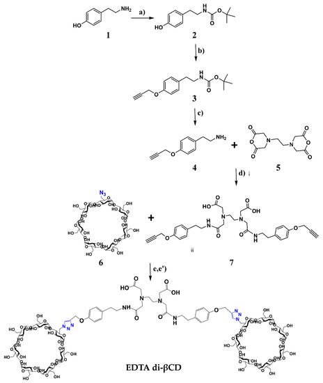 The synthetic pathway of EDTA di-βCD and EDTA G0-βCD dendritic molecules is shown in Scheme 1 and Scheme 2. The synthesis started with the functionalization of the EDTA core with propargyl tyramine derivative 4. Tyramine (1) was selectively protected by the slow addition of di-tert-butyl dicarbonate (Boc2O) under controlled temperatures in anhydrous tetrahydrofuran (THF) [51,52], giving N-Boc tyramine 2 in a 98% yield. Intermediate 2 was used for Williamson etherification in the presence of propargyl bromide in basic conditions and anhydrous N,N-dimethylformamide (DMF) in order to obtain propargylated intermediate 3 in a 93% yield [53]. Subsequently, compound 3 was deprotected in 1:1 dichloromethane:trifluoro acetic acid (CH2Cl2:TFA) mixture at low temperatures, leading to compound 4 [54]. An acid–base extraction was performed after the deprotection reaction was completed. Product 4 in the –NH3+ protonated form was present in the aqueous phase. Extraction of compound 4 in the organic phase was done after adjusting the pH value to 12. In this way, the exposition time of product 4 in a strongly acidic medium was greatly reduced, making it possible to recover the desired compound 4 in a 91% yield without the need for further purification.