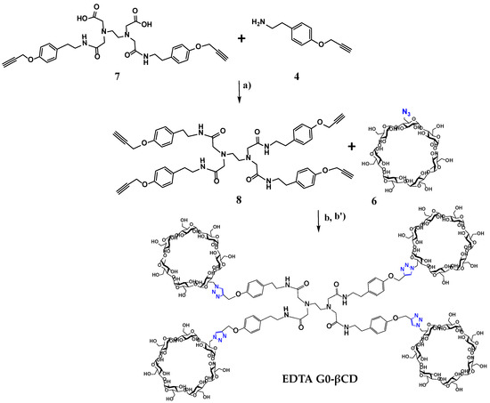 Synthesis of EDTA G0-βCD dendrimer. Conditions: (a) EDC·HCl, HOBt, 2.2 eq H2N(CH2)2C6H4-O-CH2C≡CH/DMF anhydrous, 24 h. (b) mN3-βCD, CuSO4•5H2O, H2Asc, DMSO:H2O (9:1), 80 °C, 12 h. (b’) mN3-βCD, CuSO4•5H2O, H2Asc, DMSO:H2O (9:1), 60 W, 90 °C, 30 min.