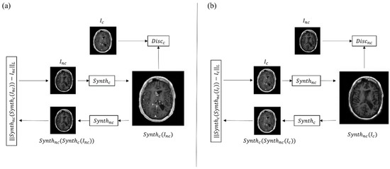 The most used GAN architectures to obtain synthetic diagnostic images ex novo from MRI and CT scans are the CycleGAN networks [37,43,47]. These are a class of deep learning algorithms that rely on the simultaneous training of two networks: the first is focused on data generation (alias generator) and the second is focused on data discrimination (alias discriminator). The two neural networks compete against each other, learning the statistical distribution of the training data, which allows the generation of new examples from the same distribution [48]. Specifically, the two generator models and the two discriminator models mentioned above are simultaneously trained. One generator takes images from the first domain and generates images for the second domain. Conversely, another generator takes images from the second domain and outputs images for the first domain. The discriminator models determine the plausibility of the generated images. An idea of cycle consistency is used in the CycleGAN. This means that the output image of the second generator should match the original image if the image output by the first generator was used as input to the second generator. A schematic picture of the described architecture can be seen in Figure 1. In all the reported studies, these networks are capable of generating true diagnostic images from a qualitative and informative point of view, demonstrating the enormous advantages of this type of application.