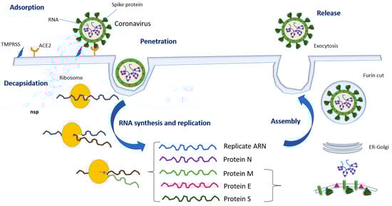 - Adsorption. In this step, the virus joins the host cell, incorporating its genetic material within it. This binding is very specific and occurs through the binding of the glycoprotein S with the angiotensin-converting enzyme 2 (ACE2) receptors found on our cells in various tissues such as the oral mucosa. The S glycoprotein of SARS-CoV-2 attaches to ACE2 and human proteases including cell surface transmembrane protease/serine (TMPRSS) proteases, furin, cathepsins, plasmin, elastase, and trypsin [,]. Many drugs are targeting this protein to avoid the interaction with ACE2 receptors and the entrance of the virus into our cells [].