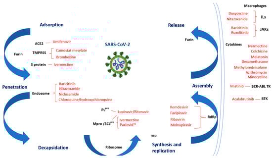 Significant potential targets against SARS-CoV-2 have been identified through bioinformatics analysis, such as viral spike (S) protein, host cellular ACE2 receptor, viral genomic RNA, molecules involved in viral mRNA syntheses such as RdRp, replication complex and viral proteases, which can block different stages of the viral life cycle [,]. The mechanisms of action of antiviral drugs are generally to inhibit the key enzymes (such as RNA-dependent RNA polymerase, reverse transcriptase and nucleoside reverse transcriptase) of virus synthesis and consequently block viral synthesis []. The therapeutic potential of several antiviral drugs in the treatment of COVID-19 is currently being evaluated, mainly by co-administration with immunomodulatory drugs or antibiotics [].