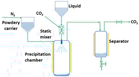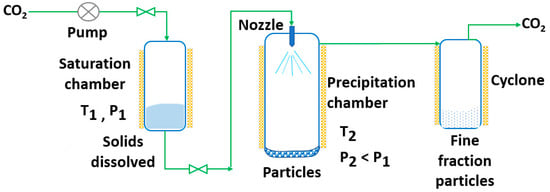 - Oliveira, J.V.D.; Priamo, W.L.; Dalmolin, I.; Boschetto, D.L.; Mezzomo, N.; Ferreira, S.R.S. Micronization processes by supercritical fluid technologies: A short review on process design (2008–2012). Acta Sci. Technol. 2013, 35. [Google Scholar] [CrossRef][Green Version]