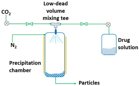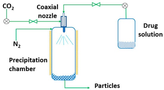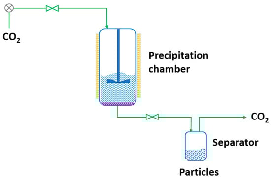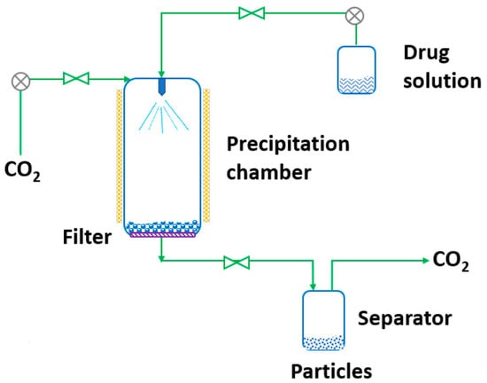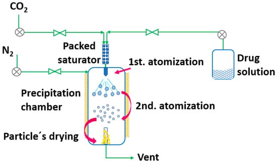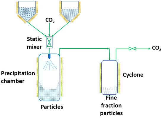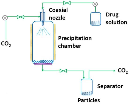 Supercritical CO2 allows the design and control of particle size depending on different operating conditions such as flow ratio, temperature, pressures, etc. []. In contrast to traditional micronization techniques, these techniques avoid or minimize the use of toxic organic solvents, allow much better control of the size and particle size distribution and can be implemented in continuous or semi-continuous operation mode. Furthermore, the materials prepared and used in supercritical CO2 are sterile, so they can be packed directly [,].