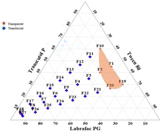 A total of 27 SNEDDS (Table 2) prototypes were prepared and observed visually. A titration of homogeneous liquid mixtures of oil, ST and CST with water was used to develop the ternary phase diagrams. Smix was prepared in various volume ratios, such as 1:1, 1:2, and 2:1. Oil and specific Smix ratios were mixed in different volume ratios ranging from 1:9 to 9:1 in order to develop SNEDDS formulation. It was observed that transparency of the formulation gets decreased, but DS get increased as the oil ratio increased. The reason behind this can be that an increase in oil phase concentration leads to increased lipid concentration in the formulation, and the concentration of ST was not sufficient to maintain homogeneous dispersion of nano size droplets due to increased interfacial tension at the oil–water interface [50]. On the other hand, when the oil concentration is low, i.e., below 30%, and the concentration of ST is high, i.e., above 40%, leads to a decrease in interfacial tension at the oil–water interface. This results in the formation of homogeneous dispersion of nano size droplets with a clear and transparent appearance. Out of 27 formulations, only five formulations (F1, F2, F10, F19 and F20) were found to be clear and termed as SNEDDS preparations (Figure 1). This indicated that the concentration of LPG was important in reducing the droplet size of SNEDDS. Similarly, among the ST (T80) and CST (TP), the higher the concentration of TP played a significant role in reducing DS to the nano level. The prepared formulations (F1, F2, F10, F19 and F20) were placed for 48 h at room temperature, and after completion of the 48 h time period, these formulations were observed visually for clarity and stability. Even after 48 h, all of the tested emulsions remained clear and transparent. As a result, these formulations have been chosen for further research.