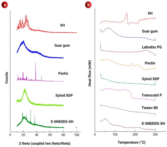 Results showing (a) overlay plot of PXRD patterns of XH, excipients and S-SNEDDS formulation; (b) DSC thermograms of XH, excipients and S-SNEDDS formulation.