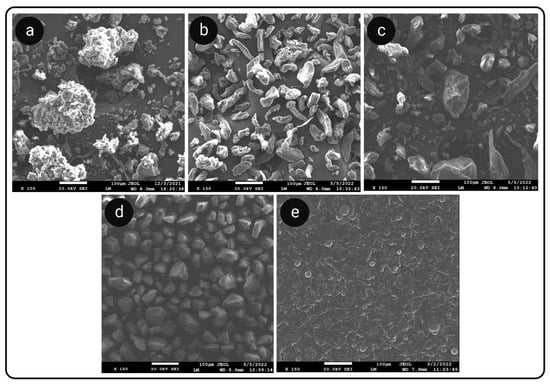 Figure 3a–e shows SEM images of raw XH, GUG, PTN, SXDP and (GUG:PTN:SXDP) S-SNEDDS powder. XH revealed crystalline particles with an irregular shape and numerous particles clumped together (Figure 3a). GUG had a flake-like cylindrical structure (Figure 3b). PTN showed a rough and globular surface structure, indicating that it is semi-crystalline in nature (Figure 3c). The surface of SXDP was discovered to be highly porous and rough (Figure 3d). The S-SNEDDS powder appeared as smooth surfaced particles with porous and spherical in shape indicating the presence of adsorbed liquid SNEDDS preconcentrate on the porous surface of carriers, particularly GUG and SXDP (Figure 3e). The obtained results were found to be similar to those obtained from PXRD and DSC studies for the developed (GUG:PTN:SXDP) S-SNEDDS formulation. The microscopic analysis findings were consistent with previous findings and matched the S-SNEDDS formulation results from PXRD and DSC studies.