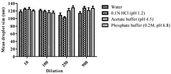 Despite the changing pH and volume of the GI fluids from stomach to colon, it is important that SNEDDS maintain their size as they move through the GIT. To test this, S-SNEDDS were diluted in four different media: water, phosphate buffer (0.2 M, pH 6.8), 0.1 M acetate buffer (pH 4.5), and 0.1 N HCl (pH 1.2). In each of the four media, S- SNEDDS (1 mL) were diluted to 10, 100, 250, and 900 times. All of the diluted samples had the same mean DS and phase separation. Each study was done in triplicate, and the mean value was recorded [45].