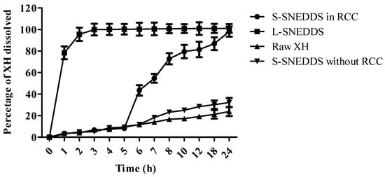 In addition, in order to check the effect of microbiota on the release behaviour of S-SNEDDS an additional study was carried out. After completion of 5 h as per the above-mentioned procedure, rat caecal contents were added, and the 7.2 pH maintained by adding 1–2 mL of NaOH. Nitrogen gas was passed to maintain the anaerobic conditions. Prior to adding the rat caecal contents it was diluted with phosphate-buffered saline (pH 6.8) to acquire desired concentrations. XH equivalent to 10 mg was present in the SNEDDS formulations subjected to dissolution studies. These SNEDDS were placed in hard gelatin capsule shells of size “000”. At predetermined time intervals, samples were withdrawn up to 24 h and a fresh medium in equal volume to the withdrawn sample volume was added in order to maintain the sink conditions. The withdrawn samples were centrifuged for 10 min at 10,000× g, supernatant was collected and filtered with the help of syringe filters (0.2 µm). The filtered samples were further analyzed at 368 nm on HPLC in order to check the release of the drug [49].