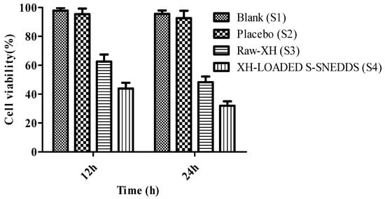 The 3-[4,5-dimethylthiazole-2-yl]-2,5-diphenyltetrazolium bromide (MTT) assay was carried out on human colorectal adenocarcinoma (Caco2) cell lines. The Caco2 cell lines (ATCC HTB-3) culture in PPMi-1640 medium (sigma) were used for this study. The study was carried out as per the procedure reported by Corrie et al. (2022) with slight modifications [49]. The cells were supplemented with 10% and 20% fetal bovine serum (FBS) and 1% penicillin-streptomycin solution (antibiotic) for nutrition. The cell was stored at a temperature of 37± 0.03 °C with incubation of CO2 (5%). The cells were seeded in a 96-well plate with a density of 15,000 cells in each cell well [50]. At the end of 24 h of incubation, the medium was replaced with different test solutions that included blank solution (PBS 200 µL, S1), Placebo SNEDDS (200 µL, S2), XH suspension (200 µM, S3), and XH loaded S-SNEDDS (200 µM, S4). These cells suspended in a new medium with different test solutions were incubated for 6 h. This was followed by a replacement of the old medium with a fresh one after 24 h. In brief, MTT (5 mg) was dissolved in 1 mL of PBS and added to each well containing test, blank and standard solution. The cells were incubated for 3 h (37 ± 0.03 °C, 5% CO2). After incubation, the old medium was replaced with dimethyl sulphoxide (100 µL per well). The plates were shaken for 10 min and optical density of the samples were measured at 570 nm using a microplate reader (Bio-Rad labs, Hercules, CA, USA). The medium was aspirated at the end of 12 h and 24 h post treatment. The percentage of survival of cells was estimated using the procedure in Equation (7) [47].