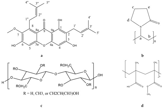 Chemical structures of (a) AM, (b) PVP, (c) HPMC, and (d) eudragit.
